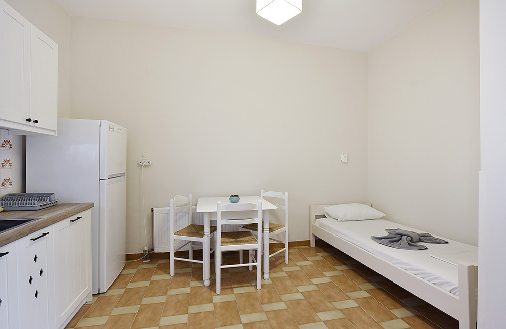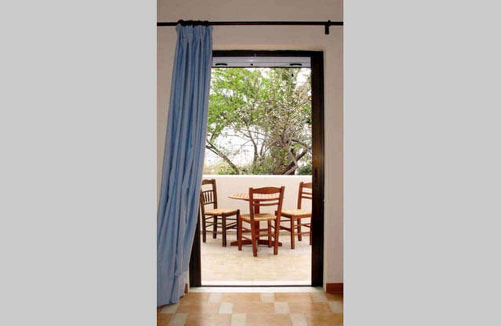 The house is a two-room apartment with one bedroom featuring a double bed and a single bed in the living room. It includes a fully equipped kitchen for cooking and a veranda with a garden view. The apartment is located 400 meters from Adamas Port and 300 meters from the shopping center and the beach. Maid service is provided, and linens are changed every third day. Free Wi-Fi is available.