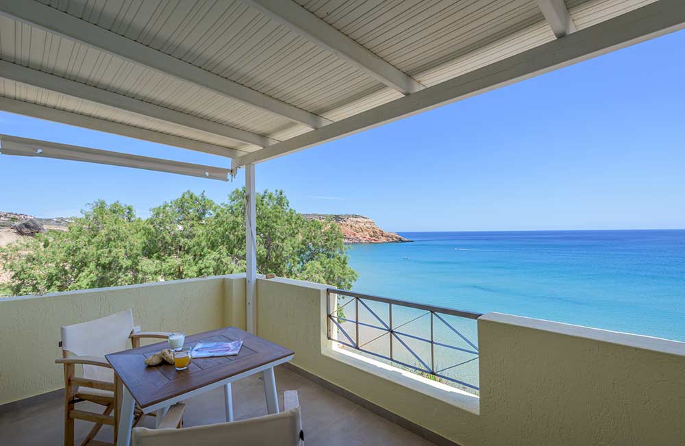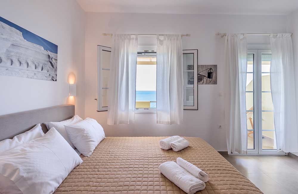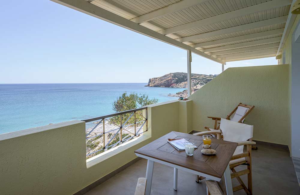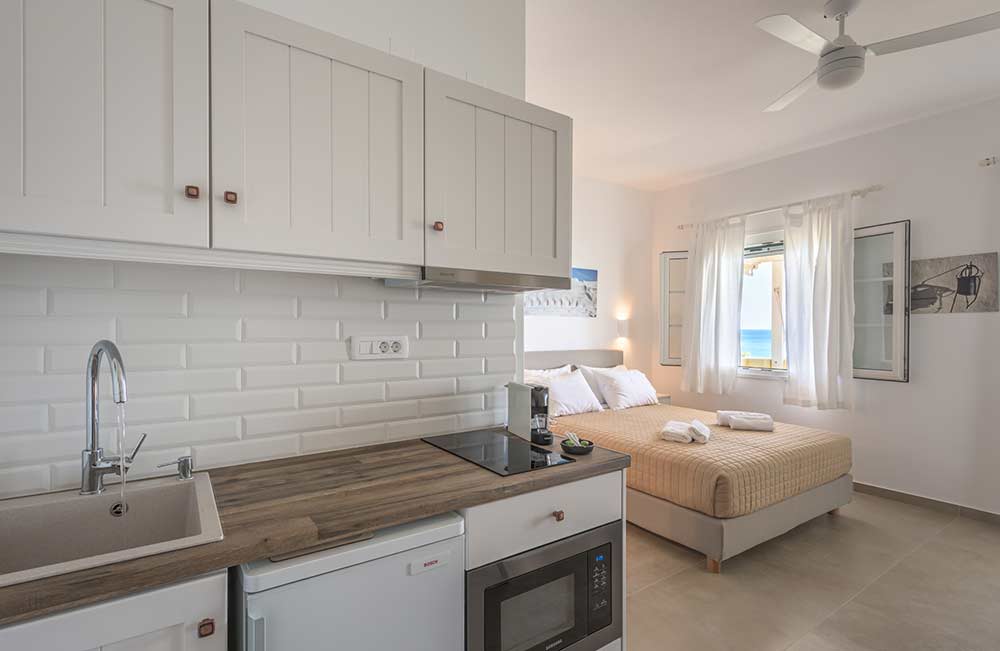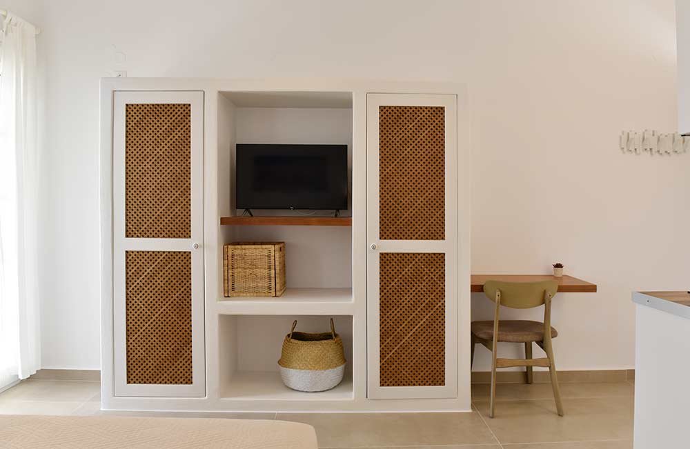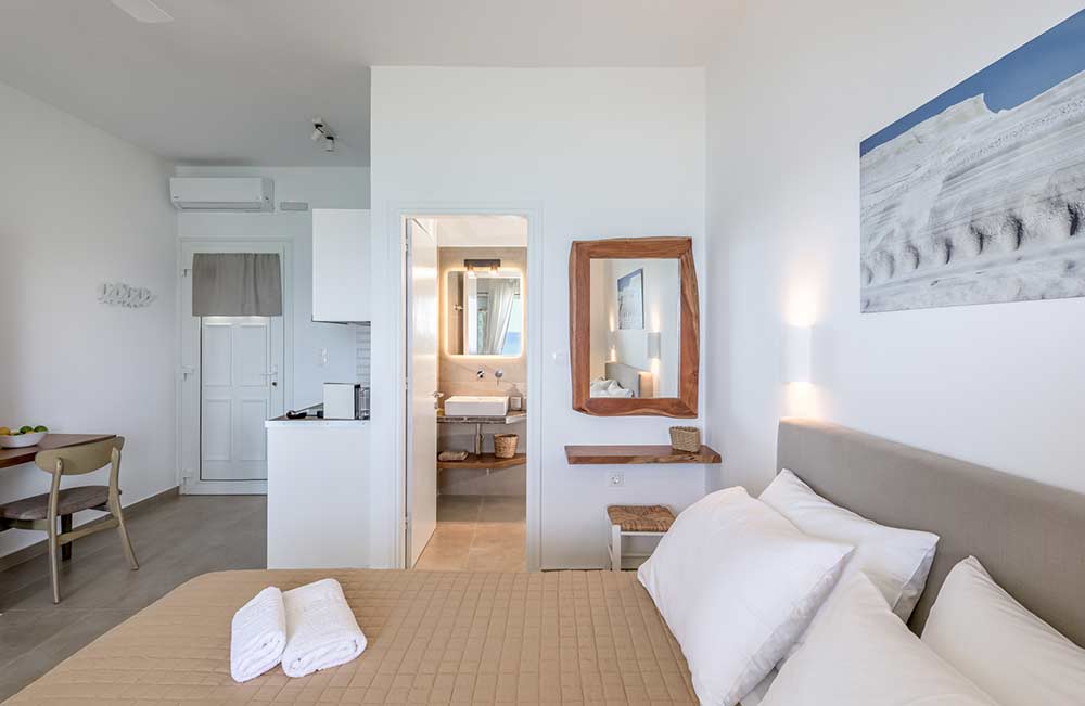 Giourgas Studios and Apartments in Milos consist of two separate buildings surrounded by a green flowery garden. The rooms can accommodate up to 4 persons and have private verandas with vistas to the sea. The large studios and two-room apartments, each with complete kitchenette and with its own veranda, are overlooking the beaches of Provatas and Agios Sostis, only 50m down the rooms, in a magical setting. All rooms are equipped with free wifi, A/C, sat TV, telephone, kitchenette, fridge and bathroom. Baby equipment is available free of charge. Daily maid service, linen is being changed every third night.